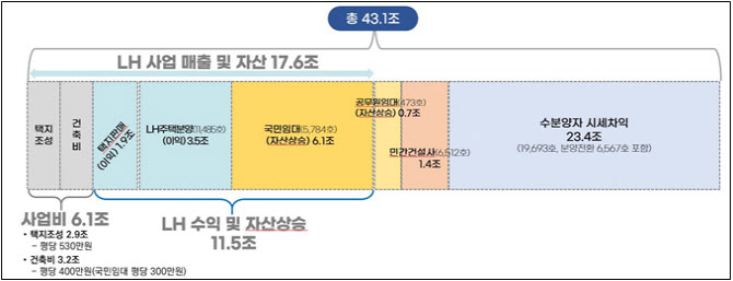 LH는 택지 판매와 아파트 분양으로 총 5조4000억원의 사업이익을 얻었으며, 국민임대주택(4개 단지)의 자산가치 상승분은 6조1000억원으로 추정됐다.