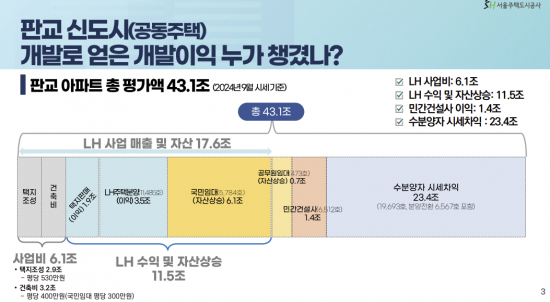24일 SH공사, SH도시연구원은 판교신도시 개발 사업 방식을 분석하고 SH(골드타운)방식을 적용한 시뮬레이션 결과를 발표했다. 먼저, 판교신도시 공동주택 개발 때 LH(한국토지주택공사)가 얻은 수익과 자산가치 상승분은 11조5000억원으로 추정했다. 이중 택지 판매 이익은 1조9000억원이고, 주택 분양 이익은 3조5000억원, 보유 중인 공공임대주택 자산 상승분은 6조1000억이다. 수분양자들이 얻은 시세차익은 23조4000억원으로 추산했다. 판교 개발이익의 54.4%에 달한다. 판교 개발에 따른 자산 가치 증가 분을 LH보다 수분양자들이 더 가져간 것이다.