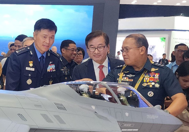 25일(현지 시간) 필리핀 마닐라에서 국제방산전시회 ‘ADAS 2024’가 열린 가운데 이영수 공군참모총장(왼쪽)과 강구영 한국항공우주산업(KAI) 사장(가운데), 스티븐 파레노 필리핀 공군사령관이 함께 KAI 부스를 둘러보고 있다.