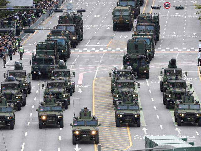 건군 제76주년 국군의 날 시가행진이 열린 1일 한국형 3축 체계(킬 체인·한국형 미사일 방어·대량응징보복) 자산들이 서울 중구 세종대로를 지나고 있다. 연합뉴스 |