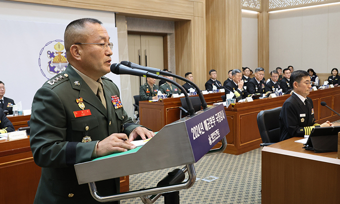 18일 충남 계룡대에서 열린 국회 국방위원회의 해군본부에 대한 국정감사에서 김계환 해병대 사령관이 의원 질의에 답변하고 있다. 뉴시스 |