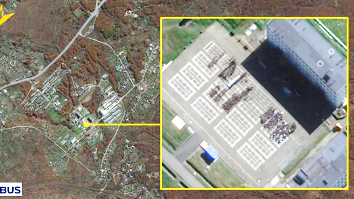 이달 16일 러시아 극동연해주 우수리스크 소재 군사시설에 북한군으로 추정되는 400여명의 병력이 운집해 있는 모습. 사진 국정원 |