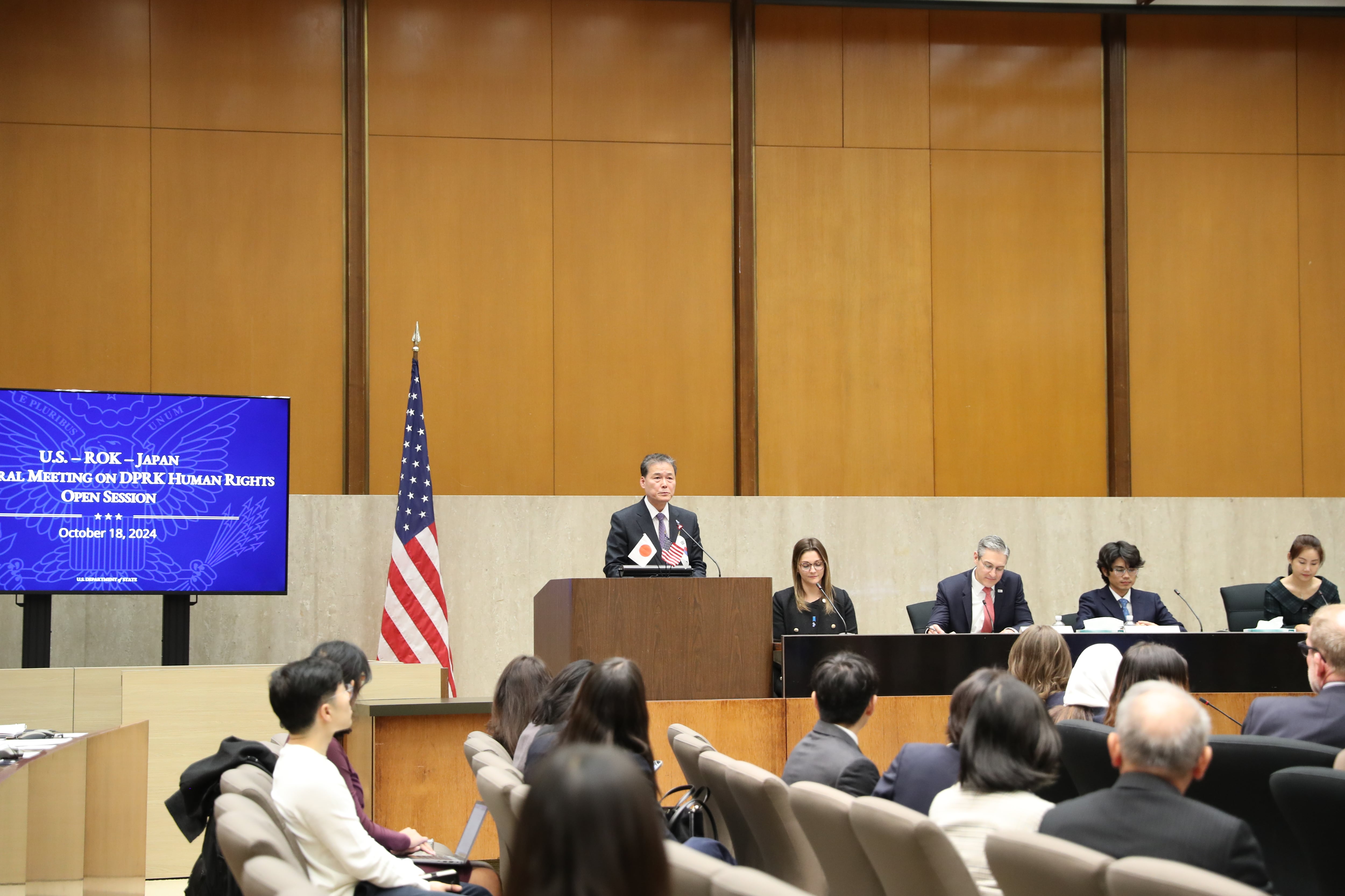 18일 미국 워싱턴DC 국무부 청사에서 열린 한미일 북한 인권 회의에서 김영호 통일부 장관이 발언을 하고 있다. /주미대사관 |