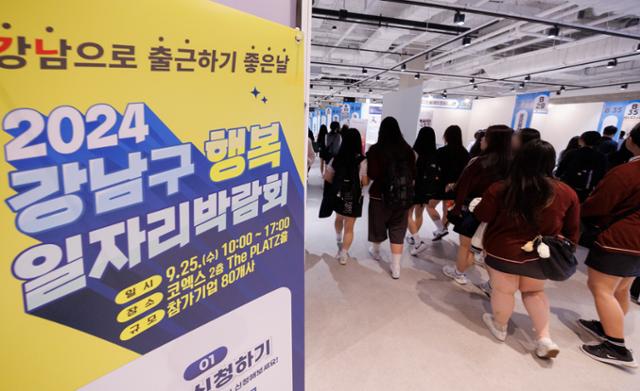 9월 25일 서울 강남구 코엑스에서 열린 2024 강남구 행복 일자리박람회에 특성화고 학생들이 입장하고 있다. 연합뉴스 |