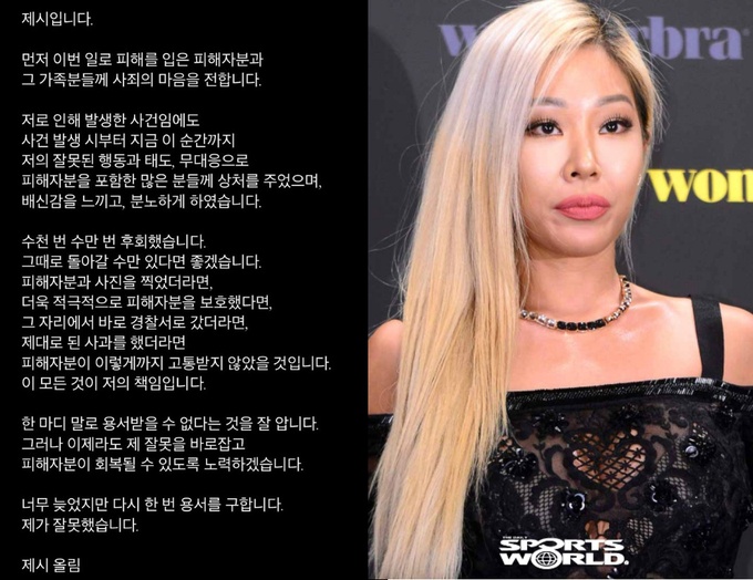 제시는 “저로 인해 발생한 사건임에도 사건 발생 시부터 지금 이 순간까지 저의 잘못된 행동과 태도 무대응으로 피해자를 포함한 많은 분들께 상처를 줬으며 배신감을 느끼고 분노케 했다”고 전했다.