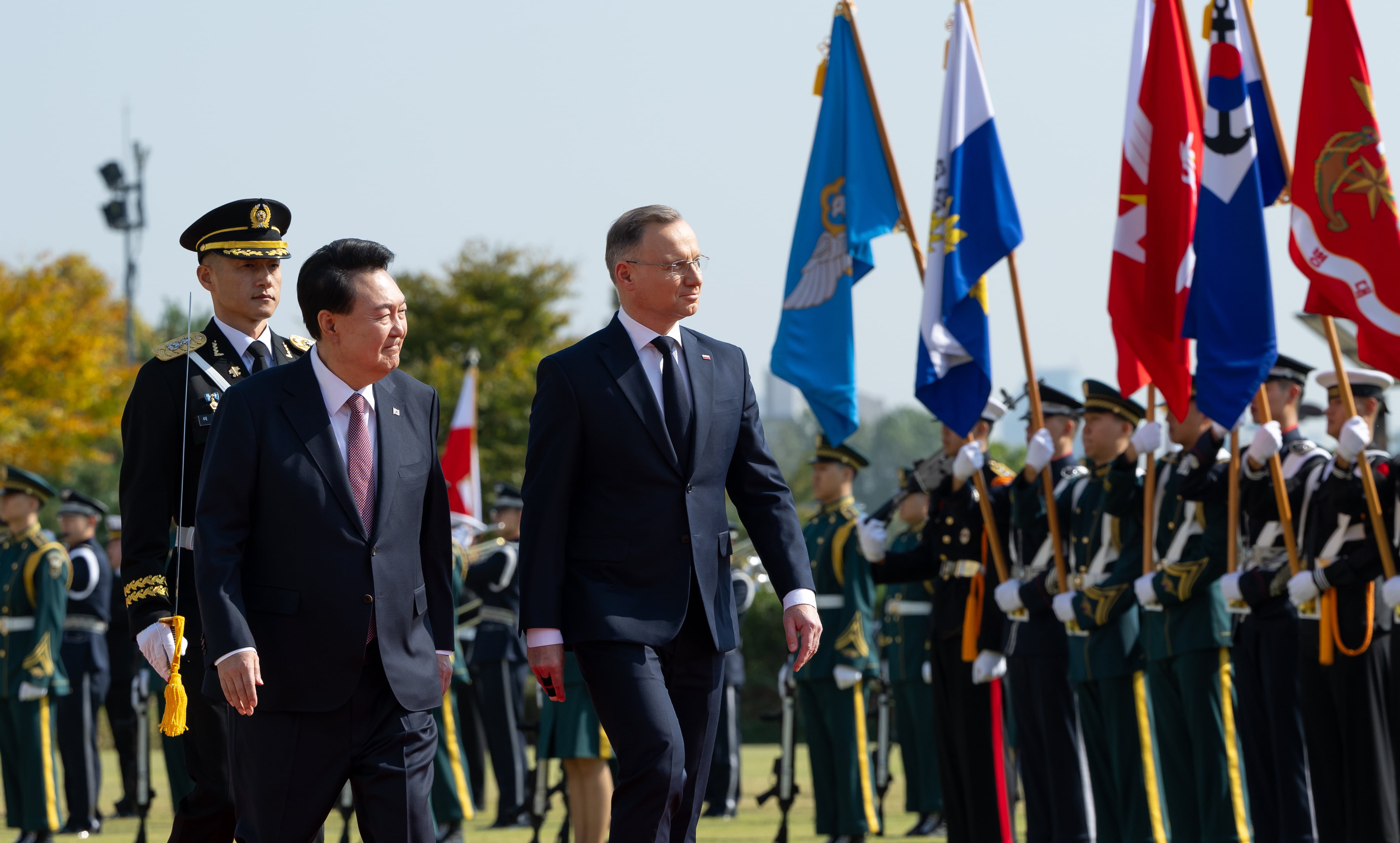 윤석열 대통령이 24일 서울 용산 대통령실 앞 잔디마당에서 열린 폴란드 대통령 국빈 방한 공식 환영식에서 안제이 두다 대통령과 의장대를 사열하고 있다. /뉴스1 |