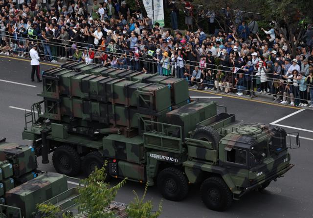 건군 제76주년 국군의날 시가행진이 열린 1일 한국형 3축 체계(킬 체인·한국형 미사일 방어·대량응징보복) 자산 중 하나인 패트리엇 미사일(PAC-II)이 서울 중구 세종대로 위를 지나고 있다. 연합뉴스 |