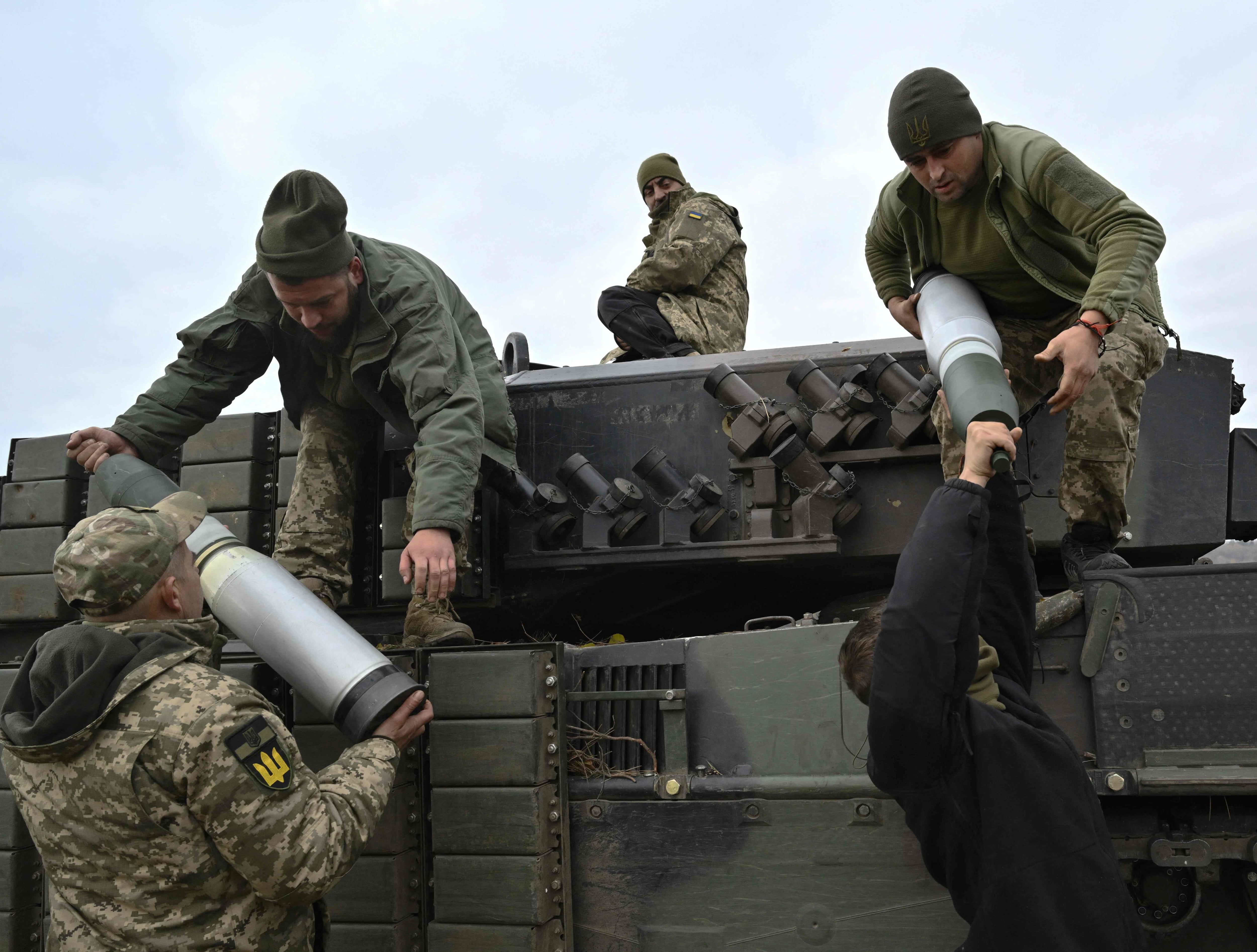 지난 27일(현지 시각) 우크라이나 모처에서 우크라이나 육군 33기계화여단 전차병들이 레오파르트 2A4 전차에 포탄을 보급하는 훈련을 하고 있다./AFP 연합뉴스 |