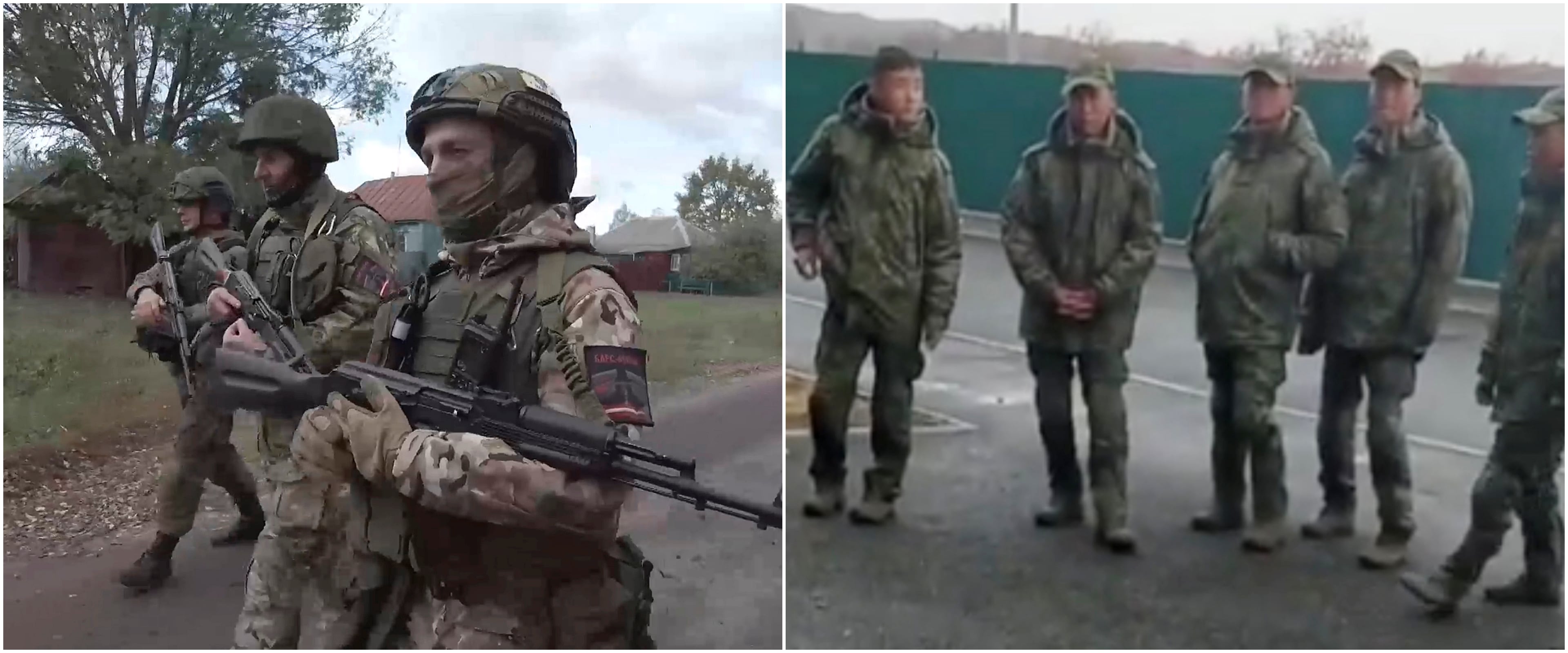 러시아 군인들이 우크라이나 접경지인 남서부 쿠르스크주(州)를 순찰하고 있다(왼쪽 사진). 오른쪽은 러시아 매체 ‘아스트라’가 지난 22일 공개한 영상의 한 장면. 북한군으로 추정되는 병사들이 러시아군 건물 앞에 모여 있다. 볼로디미르 젤렌스키 우크라이나 대통령은 “이들 북한군이 27~28일쯤 전투 지역에 투입될 것으로 보인다”고 했다. /AP 연합뉴스·텔레그램 |
