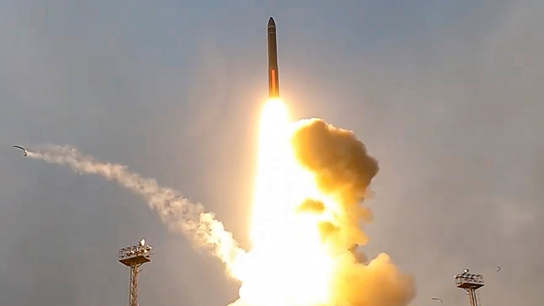 지난 10월 러시아 북서부 아르한겔스크주의 플레세츠크 우주기지에서 야르스 대륙간탄도미사일이 발사되는 모습. 이 미사일 발사는 핵 억지력 훈련의 하나로 실시됐다. /EPA 연합뉴스 |