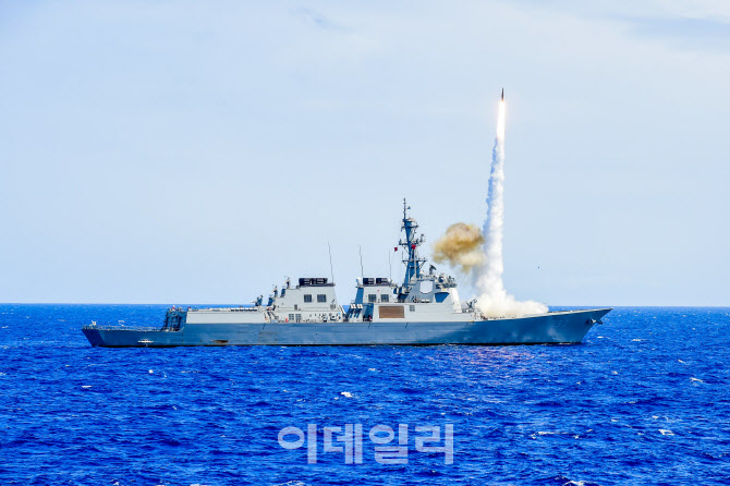 미 이지스 전투체계 탑재 구축함인 해군 이지스구축함 율곡이이함이 ‘2024 환태평양훈련(RIMPAC)’에서 고속으로 접근하는 대공무인표적기를 향해 함대공유도탄을 발사하고 있다. (사진=해군) |