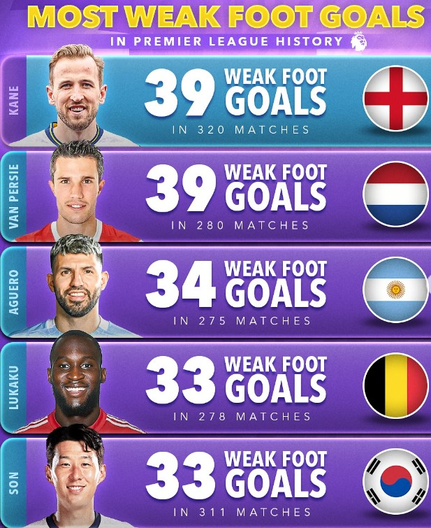 여기서 손흥민과 함께 순위에 오른 선수들의 이름이 내로라하다. 프리미어리그에서 약발로 가장 많은 골은 넣은 선수는 손흥민의 전 동료이기도 했던 해리 케인이었다. 케인은 약발인 왼발로 통산 39골을 넣었다. 역시 프리미어리그 통산 득점 2위 다운 모습이었다.