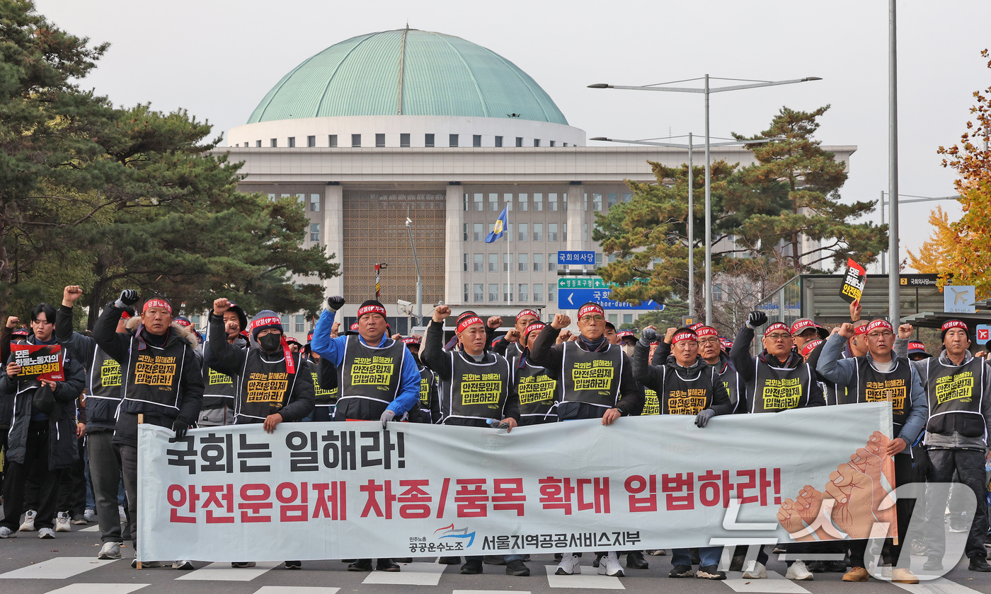 (서울=뉴스1) 장수영 기자 = 민주노총 공공운수노조 화물연대본부 조합원들이 25일 오후 서울 여의도 국회 앞에서 '화물연대 집중투쟁, 국회 진격의 날' 집회를 갖고 국민의힘 당사 방향으로 행진하고 있다. 2024.11.25/뉴스1