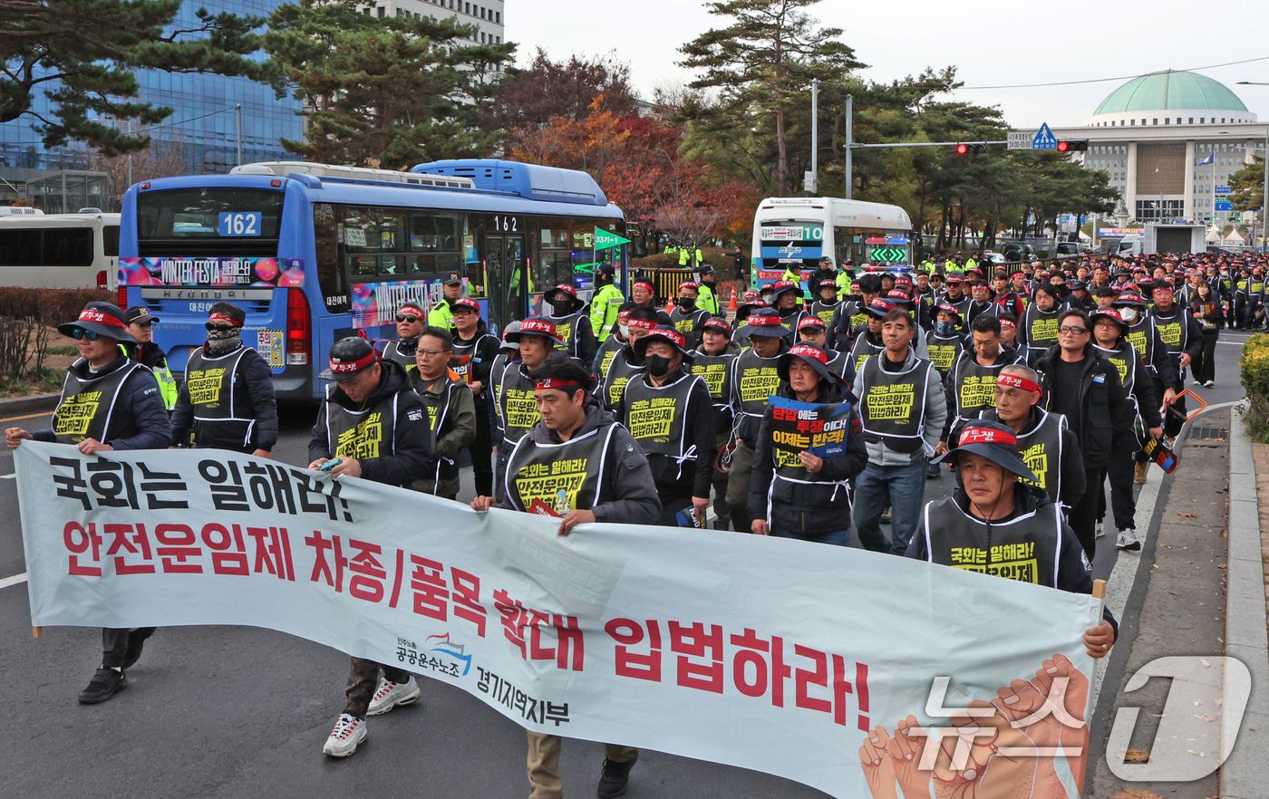 (서울=뉴스1) 장수영 기자 = 민주노총 공공운수노조 화물연대본부 조합원들이 25일 오후 서울 여의도 국회 앞에서 '화물연대 집중투쟁, 국회 진격의 날' 집회를 갖고 국민의힘 당사 방향으로 행진하고 있다. 2024.11.25/뉴스1