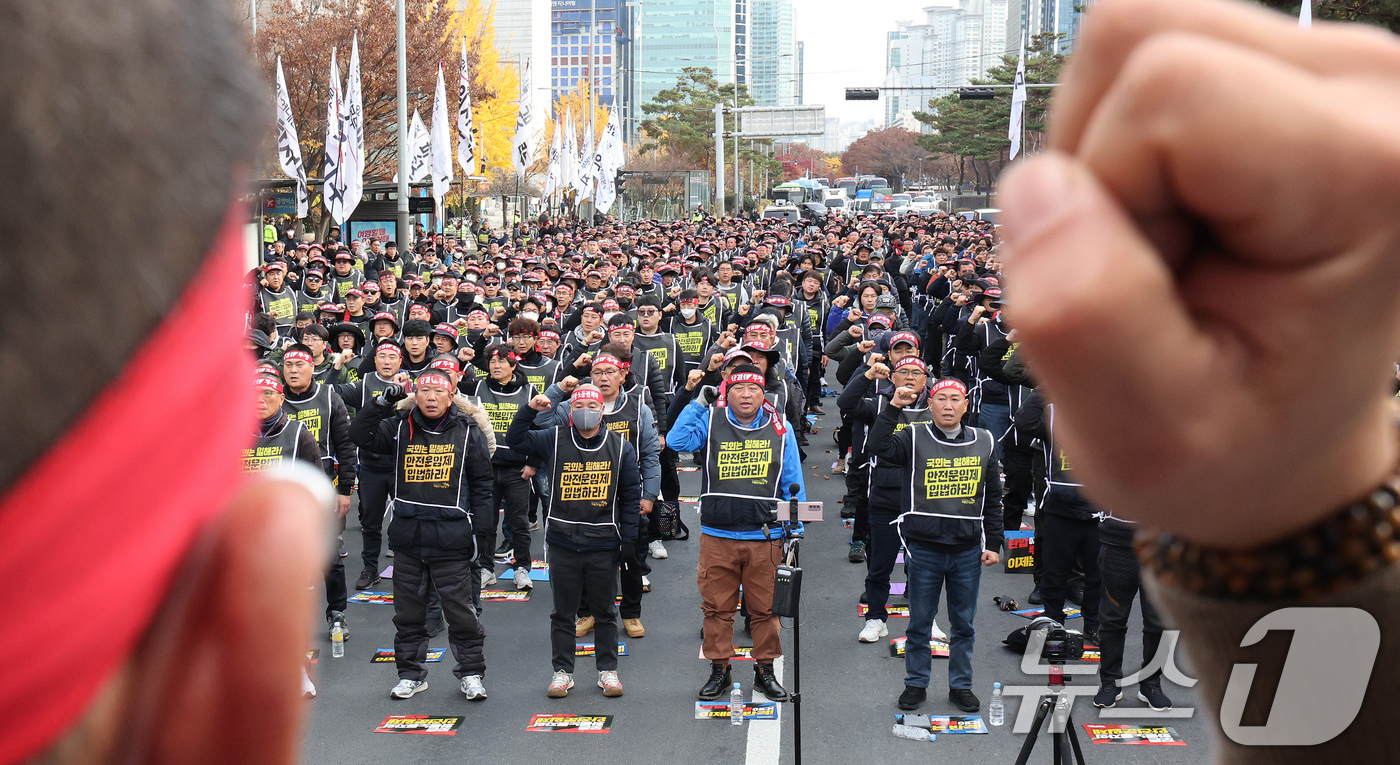 (서울=뉴스1) 장수영 기자 = 민주노총 공공운수노조 화물연대본부 조합원들이 25일 오후 서울 여의도 국회 앞에서 '화물연대 집중투쟁, 국회 진격의 날' 집회를 갖고 안전운임제 확대 입법을 촉구하고 있다. 2024.11.25/뉴스1