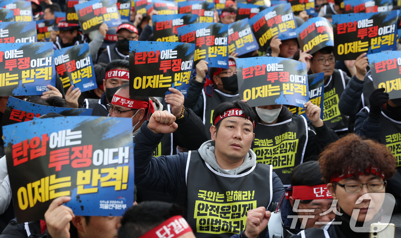 (서울=뉴스1) 장수영 기자 = 민주노총 공공운수노조 화물연대본부 조합원들이 25일 오후 서울 여의도 국회 앞에서 '화물연대 집중투쟁, 국회 진격의 날' 집회를 갖고 안전운임제 확대 입법을 촉구하고 있다. 2024.11.25/뉴스1