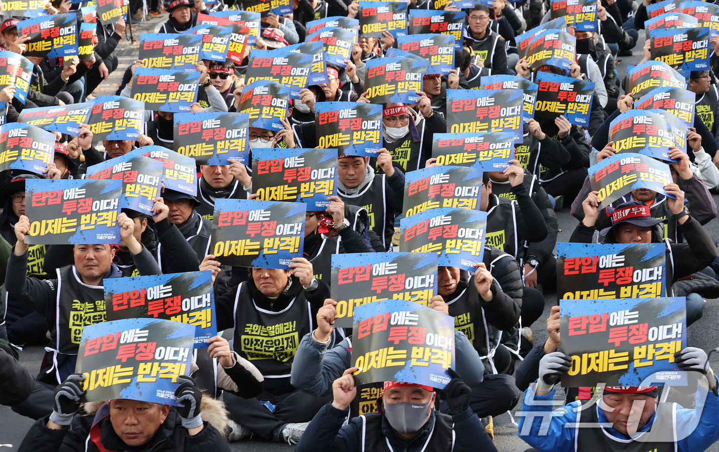 (서울=뉴스1) 장수영 기자 = 민주노총 공공운수노조 화물연대본부 조합원들이 25일 오후 서울 여의도 국회 앞에서 '화물연대 집중투쟁, 국회 진격의 날' 집회를 갖고 안전운임제 확대 입법을 촉구하고 있다. 2024.11.25/뉴스1