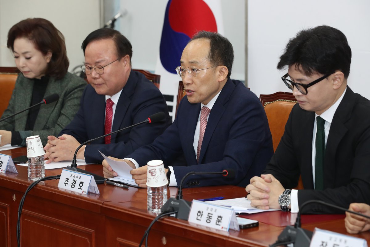 추경호 국민의힘 원내대표가 11일 오전 서울 여의도 국회에서 열린 최고위원회의에서 발언하고 있다. 왼쪽부터 김민전, 김재원 최고위원, 추 원내대표., 한동훈 대표. 2024.11.11/뉴스1 |