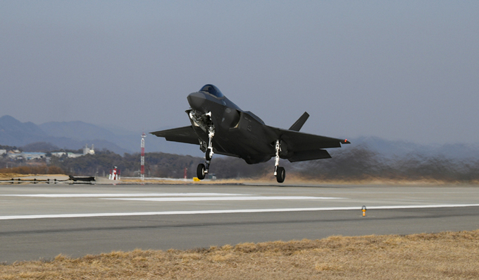한국 공군 스텔스 전투기 F-35A가 훈련을 위해 이륙하고 있다. 공군 제공 |
