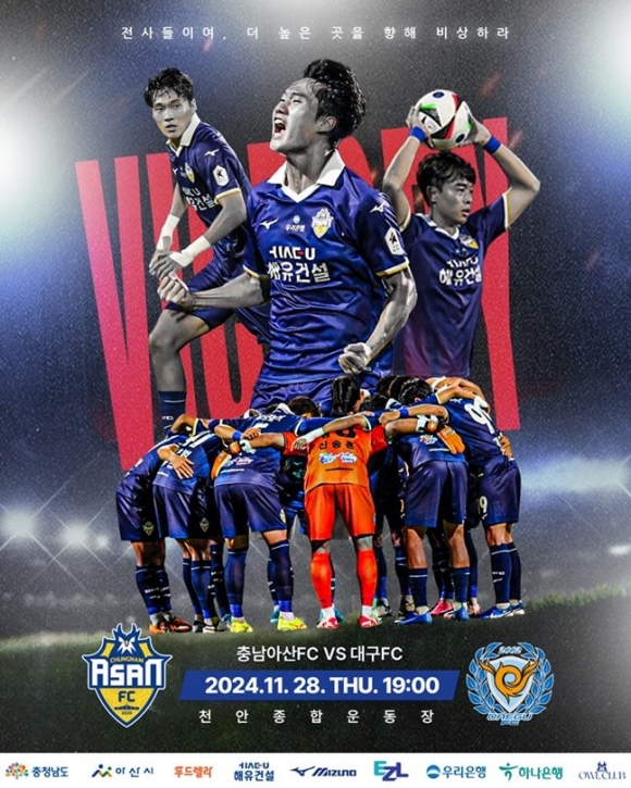 26일 아산FC에 따르면 오는 28일 천안종합운동장(임시 홈경기장)과 12월 1일 DGB대구은행파크에서 는 K리그1 대구FC와 승강 플레이오프를 진핸한다.