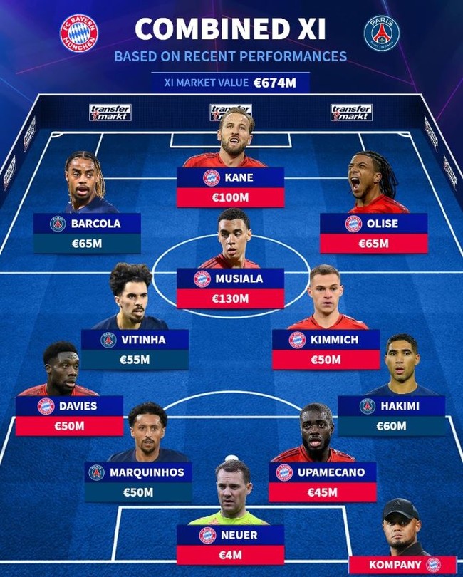 축구 통계 매체 '트랜스퍼마크트'는 26일(한국시간) 공식 SNS를 통해 바이에른 뮌헨-파리 생제르맹(PSG) 통합 베스트11을 공개했다.