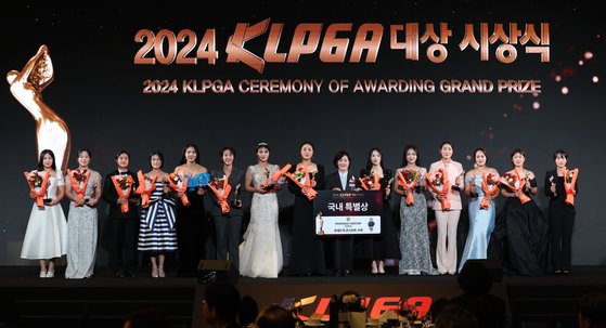 27일 오후 서울 강남구 그랜드 인터컨티넨탈 파르나스 호텔에서 열린 KLPGA 대상 시상식에서 국내특별상 부문 수상자들이 기념촬영을 하고 있다. 가운데가 김순희 수석 부회장, 왼쪽이 3관왕(위메이드 대상, 상금왕, 최저타수상)이 된 윤이나다. 윤이나는 KLPGA 투어에서 우승자가 받는 특별상을 포함해 4차례 시상대에 올랐다. 윤이나는 “내게 만점을 주고싶다. 1점도 빼고 싶지 않다. 많은 일이 있었는데 잘 견뎌냈고 잘 적응해냈다”고 말했다. 다승왕은 각각 3승을 거둔 마다솜, 박지영, 박현경, 배소현, 이예원이 공동 수상했다. 신인상은 유현조, 인기상은 황유민, 기량발전상은 배소현이 차지했다. [뉴시스]