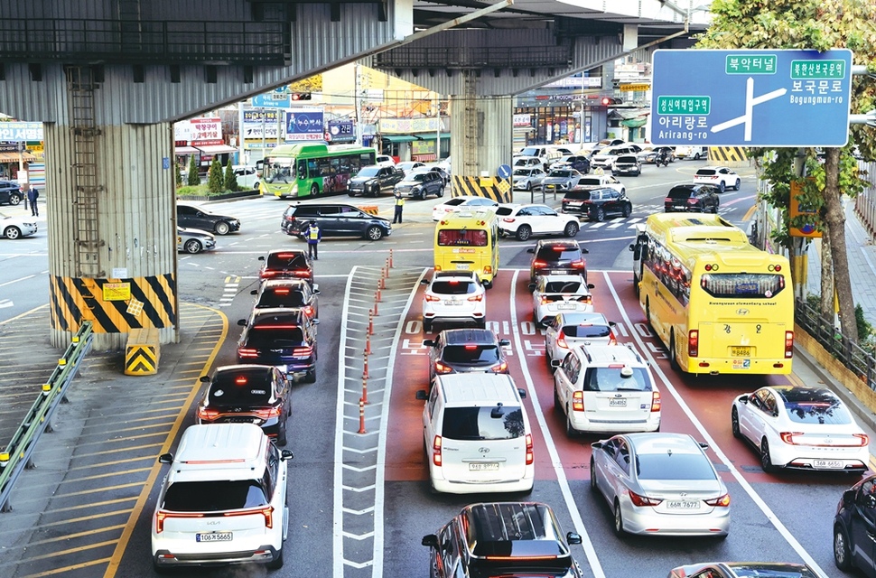 5일 오전 서울 성북구 정릉동 아리랑고개교차로가 출근하려는 차량으로 인해 정체를 빚고 있다. 김명진 기자 littleprince@hani.co.kr |