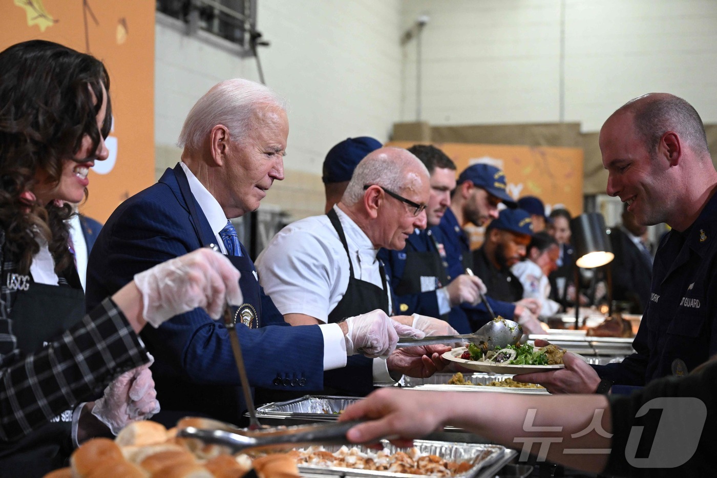 조 바이든 미국 대통령이 25일(현지시간) 추수 감사절을 앞두고 뉴욕 스테이튼 아일랜드에서 해안 경비대원과 가족들에게 배식 봉사를 하고 있다. 2024.11.26 ⓒ AFP=뉴스1 ⓒ News1 우동명 기자 |