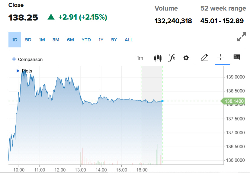 엔비디아 주가 추이. 29일(현지시간) 종가 138.25달러. 출처 CNBC |