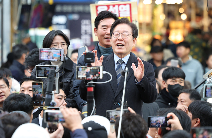 이재명 더불어민주당 대표가 1일 오후 경북 포항시 죽도시장을 찾아 시민들에게 인사하고 있다. 연합뉴스 |