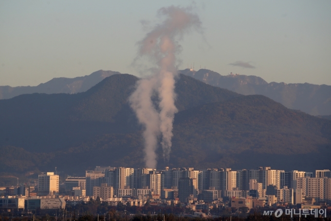 절기상 입동(立冬)인 7일 오전 기온이 크게 내려간 가운데 대구 동구 혁신도시 일대 지역난방을 위한 열 공급설비가 가동되자 굴뚝에서 발생한 수증기가 연기처럼 피어오르고 있다. /사진=뉴스1 |
