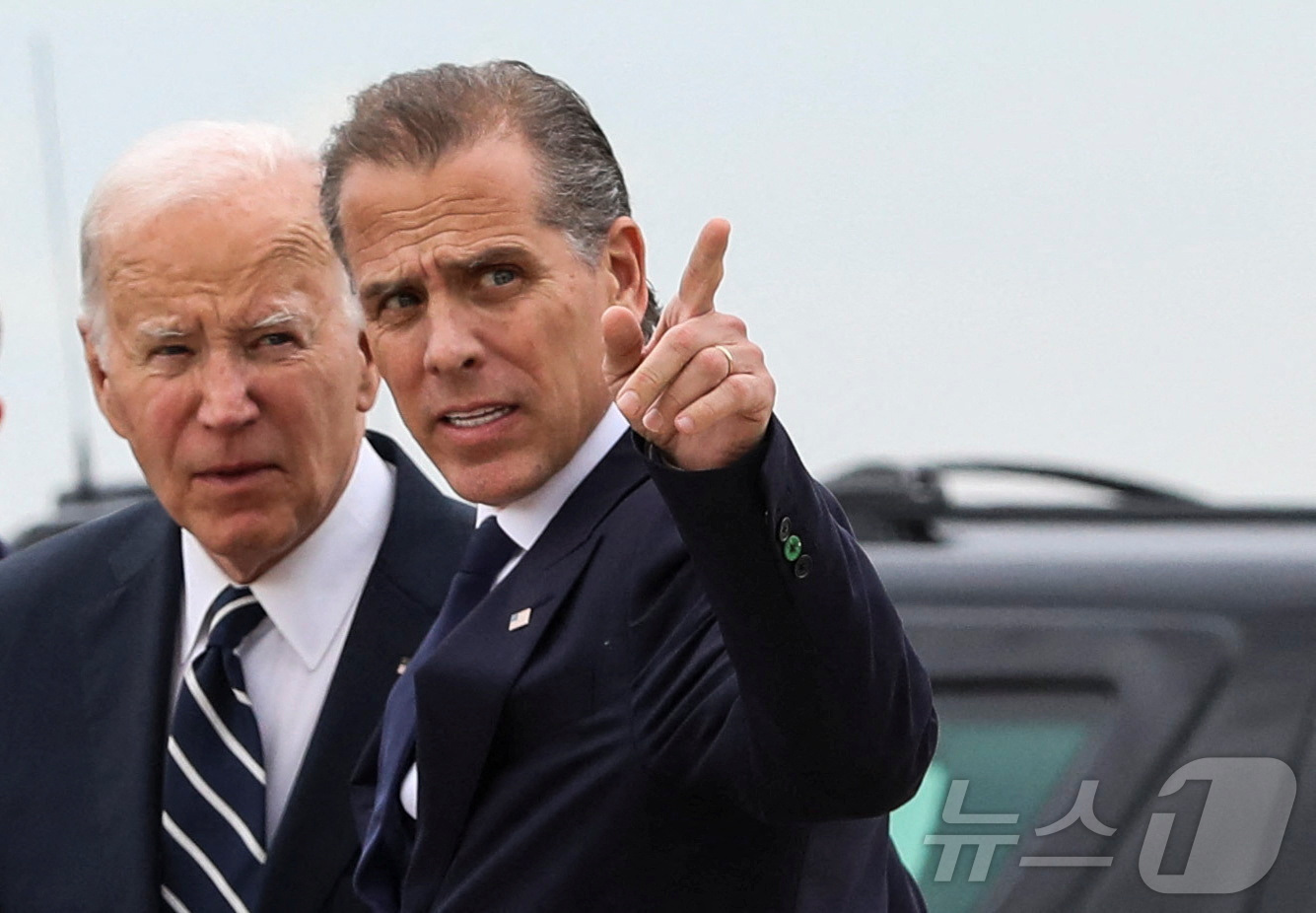 11일(현지시간) 미국 델라웨어주 뉴캐슬의 주 방위군 기지에서 조 바이든 대통령이 아들 헌터 바이든과 대화를 나누고 있다. 2024.06.11/ ⓒ 로이터=뉴스1 ⓒ News1 박재하 기자 |
