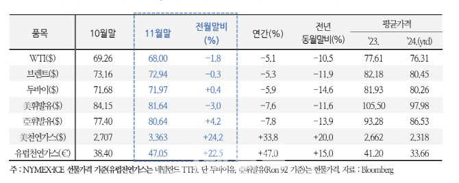 지난 11월 국제유가는 OPEC+의 감산 완화 연기, 주요 생산국의 생산 차질 등에도 중동 휴전협상 타결, 중국 경기부양책 실망감 및 경제지표 약화, 달러 강세 등으로 한 달 만에 하락했다. 11월 서부텍사스산원유(WTI)는 전월 말 대비 1.8% 하락했다.