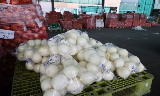 서울 송파구 가락도매시장 채소집하장에 산지에서 올라온 양파가 쌓여 있다. 사진=조용준 기자 |