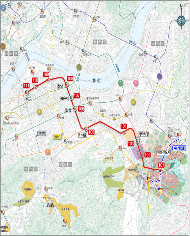 위례신사선 도시철도 노선도(예정) [자료=서울시] |