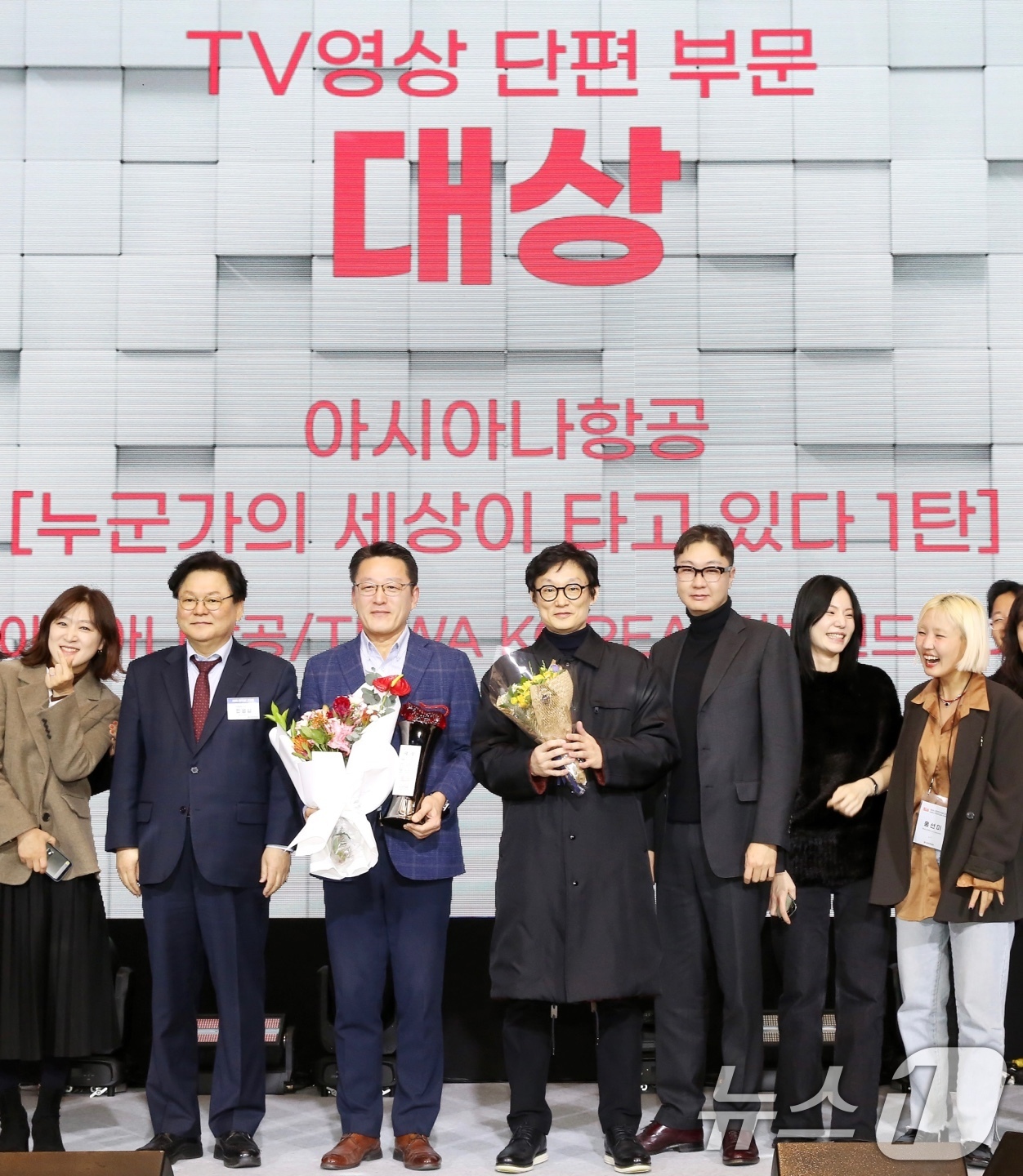 (서울=뉴스1) = 박수상 아시아나항공 커뮤니케이션 담당 상무(왼쪽 세 번째)가 3일 서울 중구 더플라자호텔 서울에서 열린 '2024 대한민국광고대상' 시상식에서 대상 등 3개 부문을 수상한 후 관계자들과 기념촬영을 하고 있다. (아시아나항공 제공) 2024.12.3/뉴스1