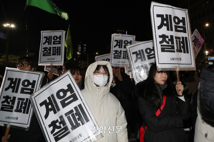 시민들이 4일 국회 의사당 앞에서 ‘계엄철폐’ 팻말을 들고 시위를 하고 있다. 2024.12.04 박민규 선임기자 |
