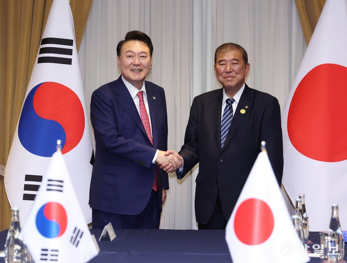 윤석열 대통령이 지난달 16일(현지시각) 페루 리마 한 호텔에서 이시바 시게루 일본 총리와 아시아태평양경제협력체(APEC) 정상회의 계기 한-일 정상회담에 앞서 악수하며 기념촬영을 하고 있다. 2024.11.17 송은석 기자 silverstone@donga.com |