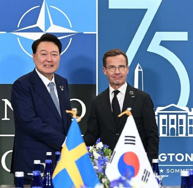 북대서양조약기구(NATO·나토) 75주년 정상회의가 개최된 지난 7월 10일(현지시간) 미국 워싱턴DC 월터 E. 워싱턴 컨벤션센터에서 열린 한-스웨덴 정상회담에서 윤석열 대통령이 울프 크리스테르손 스웨덴 총리와 악수하고 있다. [사진=연합뉴스] |