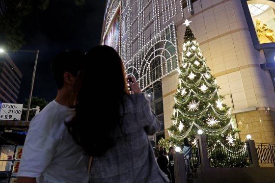 서울 중구 롯데백화점 본점 앞에 크리스마스 트리 장식이 설치돼있다. 연합뉴스 |