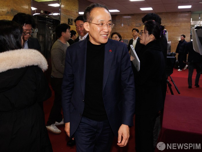 [서울=뉴스핌] 윤창빈 기자 = 추경호 국민의힘 원내대표가 4일 오후 서울 여의도 국회에서 열린 비상의원총회에 참석하고 있다. 2024.12.04 pangbin@newspim.com