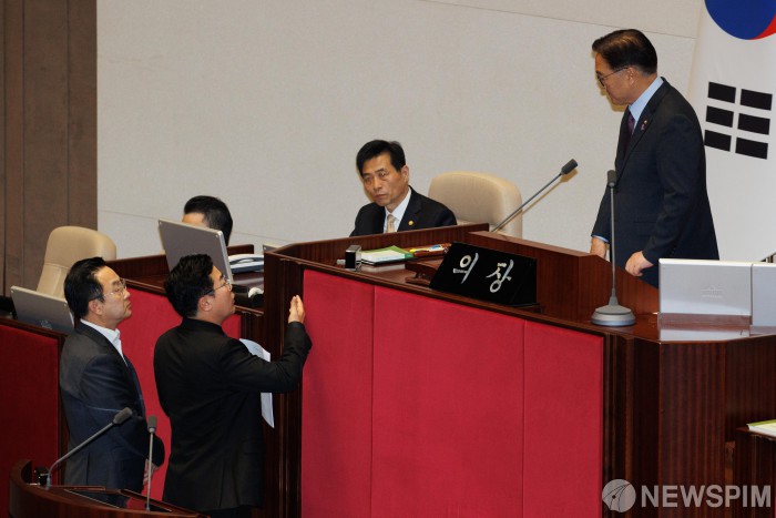 [서울=뉴스핌] 윤창빈 기자 = 우원식 국회의장이 5일 새벽 서울 여의도 국회에서 열린 제418회국회(정기회) 제418-16차 본회의에서 박찬대 더불어민주당 원내대표, 박성준 원내수석부대표와 의사일정과 관련해 대화를 나누고 있다. 2024.12.05 pangbin@newspim.com