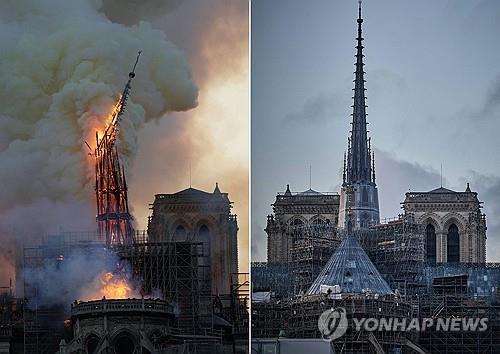 2019년 4월15일 불에 타던 노트르담 대성당과 현재 복원된 대성당 모습. |