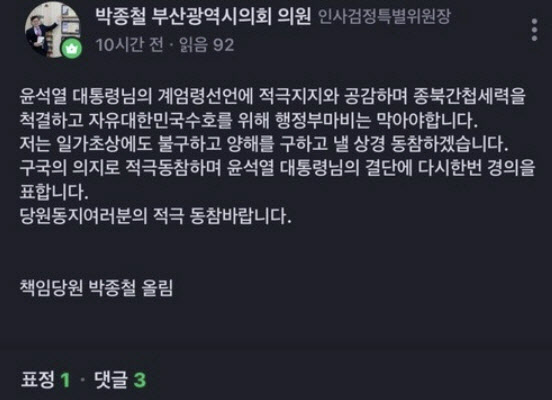 박종철 국민의힘 시의원은 비상계엄 선포 직후인 지난 3일 오후 11시16분쯤 자신의 사회관계망서비스(SNS)를 통해 “대통령의 계엄령 선언에 적극 지지와 공감하며 종북 간첩 세력을 척결하고 자유대한민국 수호를 위해 행정부 마비를 막아야 한다”며 “구국의 의지로 적극 동참하며 윤석열 대통령님의 결단에 다시 한번 경의를 표한다”고 남겼다.