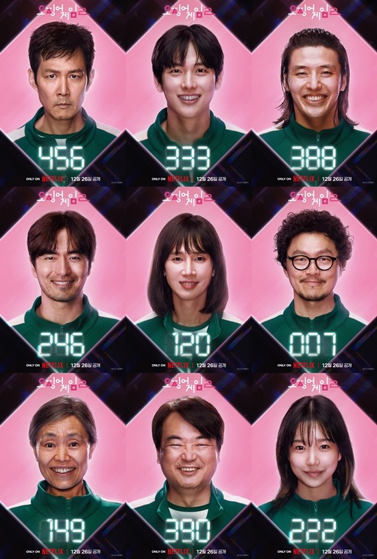 공개된 '오징어 게임' 시즌2 1차 캐릭터 포스터는 작품 속 게임 참가자들이 게임 참가 직전에 찍는 프로필 사진을 연상시킨다. 게임을 끝내기 위해 돌아온 456번 ‘기훈’의 포스터는 웃음기 없는 진지한 표정으로 이 게임이 처음인 다른 참가자들과 대조된다. 순수하고 해맑았던 시즌1 때와는 다른 분위기를 풍기는 ‘기훈’의 모습에서는 게임의 배후를 밝히기 위해 목숨을 걸고 게임에 다시 참여한 그의 집념과 강한 의지를 엿볼 수 있다.