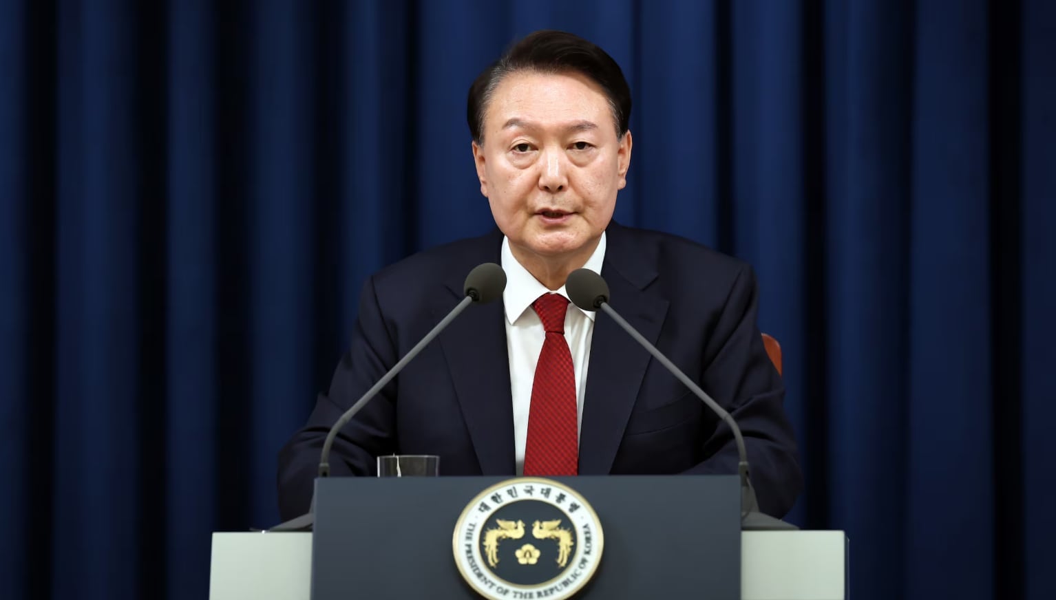 윤석열 대통령이 지난 3일 밤 용산 대통령실 청사에서 ‘긴급 대국민 특별 담화’를 통해 비상계엄 선포를 발표하고 있다. /대통령실 |