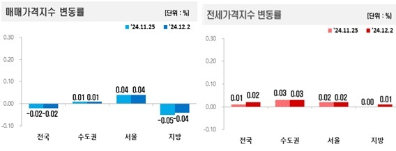 5일 한국부동산원이 발표한 12월 첫째 주(2일 기준) 매매·전세 동향에 따르면 전국 아파트 매매가는 전 주와 같은 -0.02%를 기록하면서 3주 연속 하락했다.