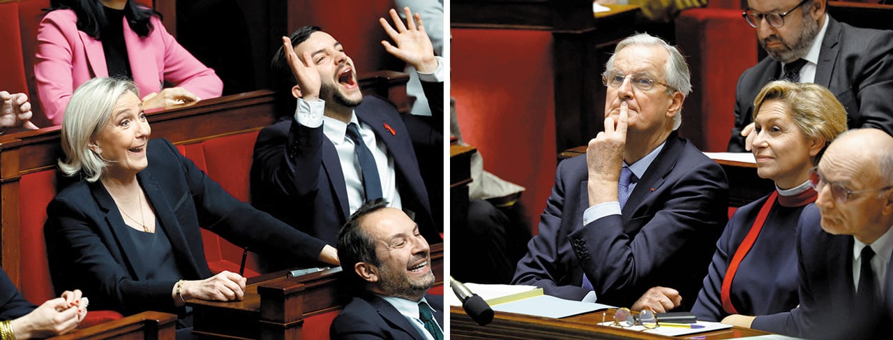 프랑스 정부·야당 엇갈린 표정 - 4일 프랑스 하원에서 미셸 바르니에 총리 불신임안이 통과되자 이를 주도한 야당과 정부 인사들의 표정이 극명히 엇갈렸다. 왼쪽 사진은 나란히 앉은 국민연합(RN)의 마린 르펜(왼쪽) 원내 대표와 장-필립 탕기 의원이 기뻐하는 모습. 반면 오른쪽 사진의 미셸 바르니에(왼쪽) 총리, 나탈리 델라트르(가운데) 총리실 의회관계 담당장관, 디디에 미고 법무장관의 표정은 굳었다. /로이터 뉴스1 |