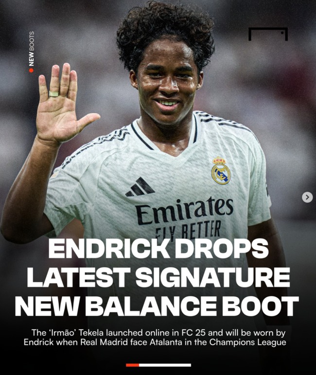글로벌 매체 '골닷컴'은 6일(한국시간) 공식 SNS를 통해 "엔드릭과 뉴발란스가 새로운 시그니처 축구화를 런칭했다. 이 축구화는 FC25(축구 게임)에서 온라인으로 처음 공개됐고, 엔드릭이 돌아오는 11일 아탈란타와의 유럽축구연맹(UEFA) 챔피언스리그(UCL) 경기에 실제로 착용할 것이다"라고 전했다.