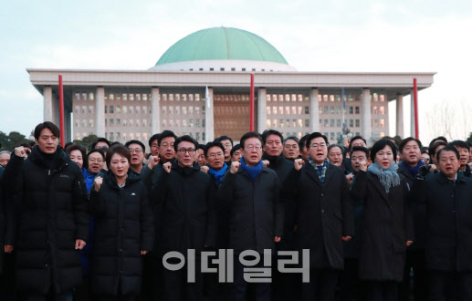 [이데일리 노진환 기자] 윤석열 대통령 탄핵소추안 표결을 앞둔 7일 이재명 더불어민주당 대표와 박찬대 원내대표 및 의원들이 서울 여의도 국회 정문 앞에서 탄핵을 촉구하며 구호를 외치고 있다. |